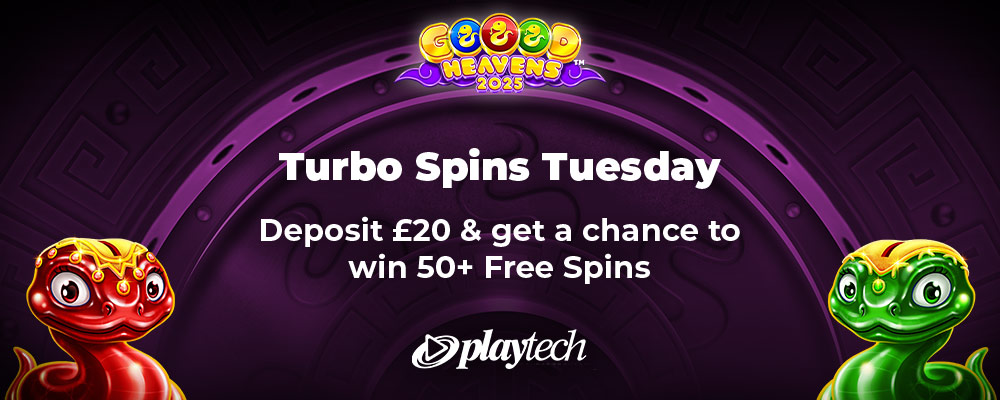 Get ready for Turbo Spins Tuesday, our brand-new weekly promotion where you can win 50+ Free Spins on a different thrilling game every Tuesday (between 6 PM & 11:59 PM)!